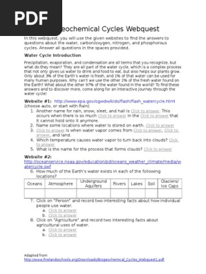 Your goal is to gain a better understanding of the carbon, nitrogen, water and phosphorus cycle. Biogeochemical cycles webquest in this webquest you will search for information that will answer questions about the water, carbon/oxygen, nitrogen and phosphorous cycles using the listed websites. Water cycle webquest answer key pdf. Start studying biogeochemical cycle webquest. 30 biogeochemical cycles worksheet answers these pictures of this page are about:biogeochemical cycles webquest answer key.